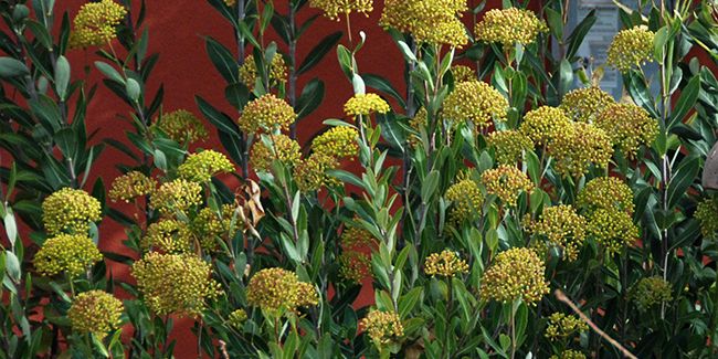 Durant l'été, de magnifiques ombelles terminales arrondies de 4 cm de diamètre, contenant des fleurs jaunes en étoile, éclosent. Ces fleurs mellifères attirent de nombreux insectes butineurs, comme les abeilles et les papillons, créant ainsi un écosystème vivant tout autour de l'arbuste.