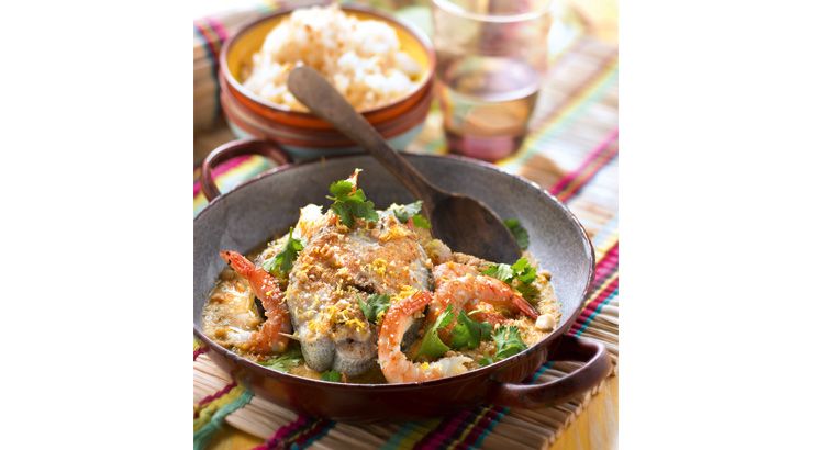 5. Dans une autre sauteuse, chauffez 1 cuillèe à soupe d'huile et faites-y colorer le poisson pendant 5 minutes de chaque côté. Ajoutez les crevettes et versez la sauce préparée. Laissez mijoter le tout pendant 15 minutes.
