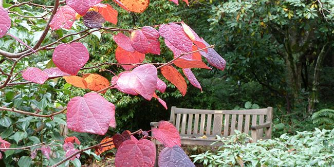 À l'automne, le disanthus dévoile un feuillage caduc fascinant, ses feuilles alternes, ovales et cordiformes, passant du vert bleuté à des teintes éclatantes de jaune, orange, rouge et pourpre. Cela tâche de le confondre avec l'arbre de Judée (Cercis siliquastrum).