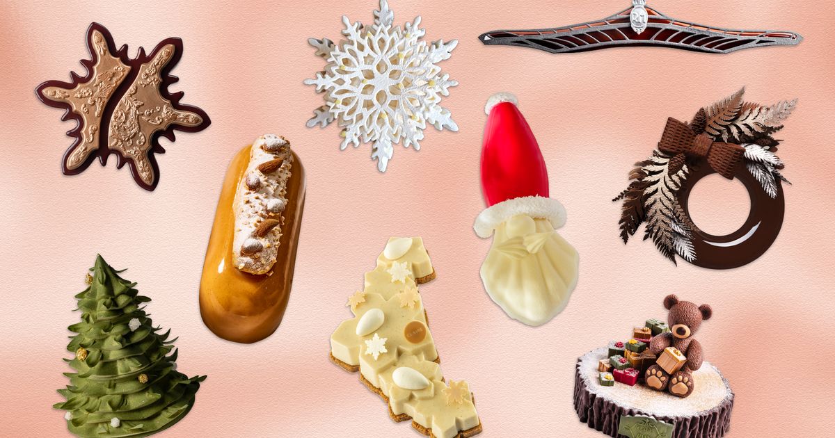 Nina Métayer, élue cheffe pâtissière de l’année, s’inspire agréablement du sapin. Sa pièce montée délicatement ornée fait appel à des poires caramélisées et des notes épicées, tandis qu'une étoile en chocolat dissimule des douceurs à partager. Pour sa part, François Perret du Ritz Paris a conçu un Père Noël en madeleine, cachant sous son bonnet un mélange de saveurs exotiques.