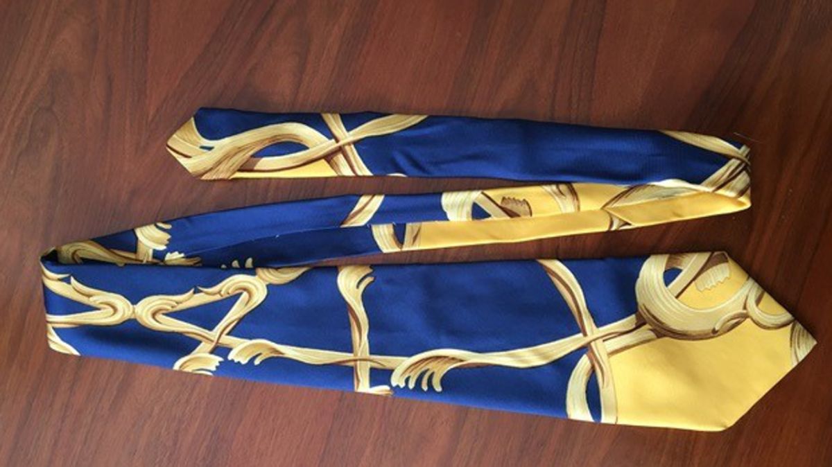 L'objet que nous allons inspecter pourrait parfaitement s'intégrer à cette ambiance : une cravate en soie aux couleurs bleu et jaune ornée de motifs dorés, attestant de sa provenance Hermès.