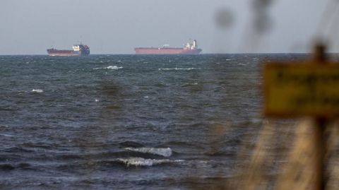 Les navires Caffa et Sea Owl I au large de Trelleborg (Suède), le 13 mars 2026, après avoir été arraisonnés par la marine suédoise. (JOHAN NILSSON / TT NEWS AGENCY / AFP)