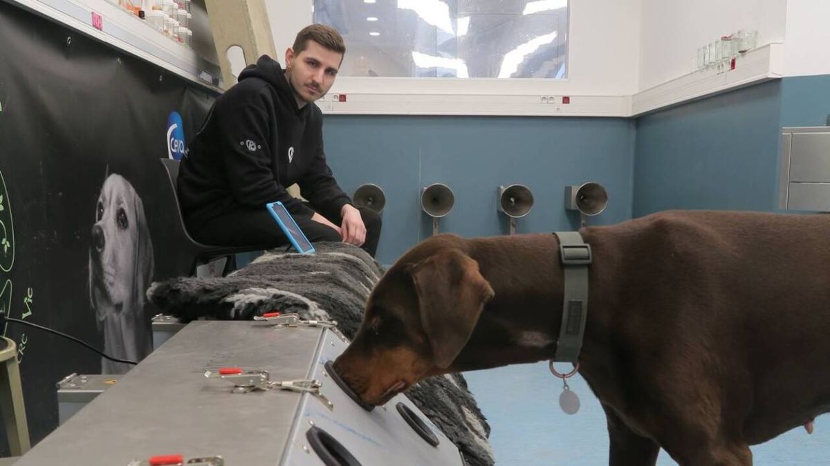 Dans la salle d’entraînement de Nosaïs, au sein de l'école vétérinaire de Maisons-Alfort près de Paris, Corinne encourage sa chienne. Le border terrier de 6 ans s'élance pour renifler chaque trou d'une machine en moins de 5 secondes.